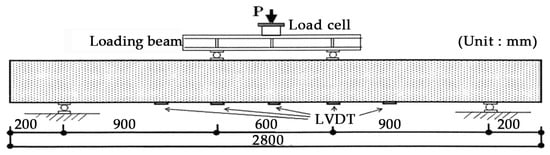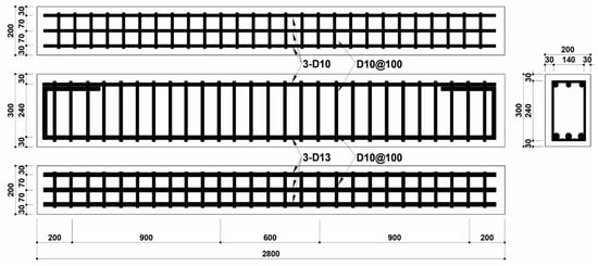 A total of 20 test specimens were fabricated, consisting of one specimen for each experimental parameter shown in Table 1, and one reference specimen for each loading condition. Each beam specimen had a 200 × 300 mm square cross-section and was 2800 mm in length. Figure 1 shows the test specimen and reinforcement details. The tension sides of the beam specimens were reinforced with three D13 rebarsreinforcement, and three D10 rebars were embedded on the compression sides.