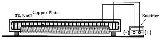 Figure 2 shows a schematic drawing of the test setup used in this study. An acrylic pool containing a sodium chloride (3% NaCl) aqueous solution was fabricated at the surface of the beam specimens by filling it to half of the specimen and inserting copper plates into the pool. This type of corrosion cell, composed of two dissimilar metals (copper and carbon steel) in contact and sharing a common electrolyte (concrete pore solution), is called a galvanic cell [63]. A galvanic current was used to monitor the corrosion process of the reinforcing steel in the present study. As shown in Figure 2, in most studies, galvanic accelerated corrosion is regarded as a method to obtain corroded steel bars quickly, and a 3~5% sodium chloride (NaCl) solution is used [63].