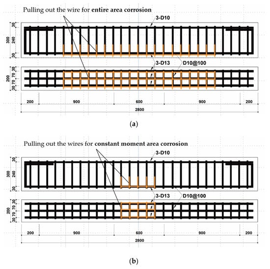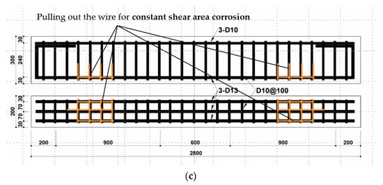 In the case of local corrosion of the entire area, the corrosion area was targeted for the tension side of the main reinforcement and the lower half of the shear reinforcements. To allow the current to flow only through the desired corrosion area, wires were connected to the main reinforcement and shear reinforcement on the tension side. In the case of the constant moment area, the tension side of the main reinforcement and the lower half of the shear reinforcements of the flexural reign were targeted at the 400 mm reign of the mid-span. In the case of the constant shear area, both sides of the shear area were targeted (not the entire shear area, but a 300 mm segment located 20 mm away from the support points).