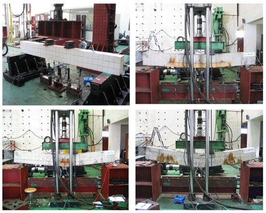 During the loading phase, the displacement was controlled, and loading was applied at the loading point at a speed of 0.025 mm/c. The unloading phase was carried out instantaneously. Figure 5 shows photos of the flexural loading test on the specimen.