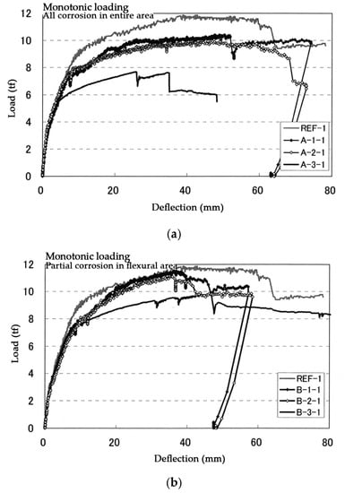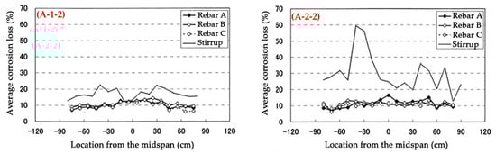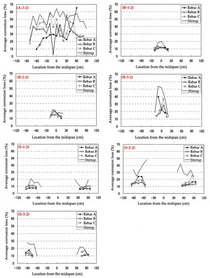 In the case of the rebar corrosion of the entire area, similar corrosion loss results were obtained from specimens A-1-2 and A-2-2. At a corrosion rate of approximately 10.6% in those specimens, the average ultimate strength was decreased to 5.7%. It is clearly shown from the test values of specimen A-3-2 in Figure 12 that the average corrosion rate fluctuates based on the location. In addition, about 33% of the average corrosion rate caused a 69.6% drop in the yield strength and a 60.9% drop in the ultimate strength. In the case of localized corrosion in the constant moment area, a gradual increase in the average corrosion rate in the order of B-3-2 > B-2-2 > B-1-2 led to corresponding strength reductions. For localized corrosion in the constant shear area, the average corrosion rate increased in the order of S-2-2 > S-3-2 > S-1-2. Although specimen S-1-2 was corroded at a rate of 7.9%, the ultimate strength was equivalent to the reference specimen. However, specimens S-2-2 and S-3-2 corroded at rates of 14.8% and 12.0%, causing an ultimate strength reduction of 5.1% and 4.9%, respectively.