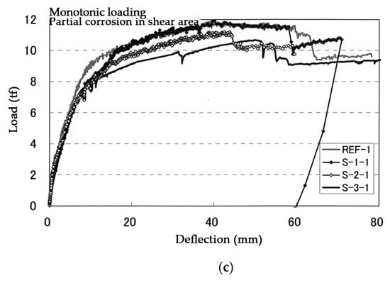 For localized corrosion in the constant shear area, the reduction in the structural capacity was insignificant compared to the entire area corrosion and the constant moment area corrosion cases. The yield load and maximum load were reduced by 0.5–16.0% and 5.6–9.9%, respectively. However, specimen S-1-1 resulted in an increase of 5.9% in the yield load and 0.3% in the maximum load.
