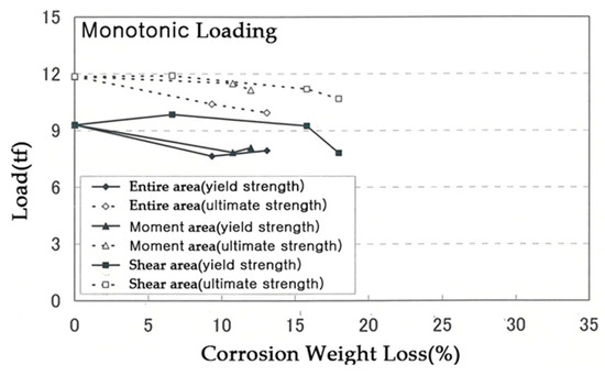 Under a monotonic load, the yield load and maximum load of the RC beam specimens, considering the corrosion of the rebar, are presented in Figure 7. Generally, an increasing corrosion rate resulted in a decrease in the structural capacity. However, it was found that localized corrosion in the constant shear area did not significantly affect the structural capacity up to an average corrosion rate of 15%.