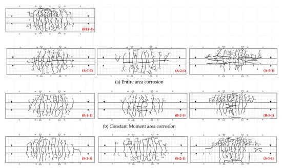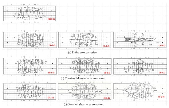 Figure 13 illustrates the crack patterns in the concrete cover and the occurrence of cracks with corroded rebars due to the imposed cyclic loads on the beam specimens. Except for specimen A-3-2, approximately 100 mm crack intervals were observed from the center of all specimens.