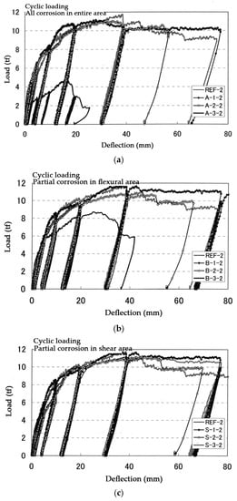 Deflection of beam versus applied cyclic load. (a) corrosion in entire area; (b) partial corrosion in mid area; (c) partial corrosion in end area.