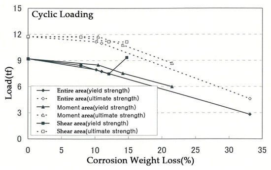 Under a cyclic load, the yield load and maximum load of the RC beam specimens, considering the corrosion of the rebar, are presented in Figure 11. Compared to the test results under a monotonic loading condition, as shown in Figure 8, the structural capacity in terms of the yield strength and ultimate strength decreased with a more pronounced tendency for each corrosion case as the corrosion rate increased. Excluding the deviated data in Figure 11 (9.35 tons at an average of 14.75% corrosion weight loss, denoted as the solid rectangular symbol), the reduction in the load-carrying capacity due to the average corrosion rates of up to 10% shows a similar trend. However, beyond this corrosion rate, a significant deterioration in the load-carrying capacity was observed especially in the entire area and localized moment area. Over a certain threshold of corrosion, the capacity definitely drops, and cyclic loading worsens this condition. The relationship between the bond strength (shear stiffness) and the level of corrosion of the reinforcements was suggested in a previous paper [41]. The bond strength decreased considerably due to the slippage between the rebar and the concrete under the tensile region, over a certain threshold of corrosion. This may cause premature failures in the case of cyclic loading [72].