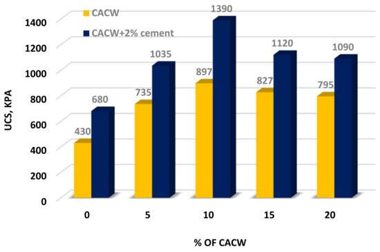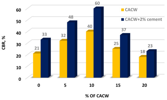 - The durability tests reveal that soil containing 10% CACW and 2% cement satisfies the specifications and stays within the 14% weight loss limit imposed by the Portland Cement Association (PCA).