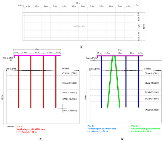 PSW configuration. (a) Plan view; (b) side view of PSW with batter pile; (c) side view of PSW with vertical pile.
