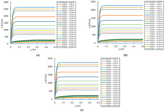 p–y curve. (a) Pile A (Ø700 mm vertical); (b) Pile B (Ø600 mm vertical); (c) Pile C (Ø600 mm battered).