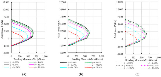 Table 10 compares the load capacities of PSW-A and PSW-B in the range of corrosion degrees from 0 to 18.58%. The maximum differences in the load capacity results for the corroded PSWs from FA-1 and FA-2 were 12.66% and 0.44%, respectively, compared to the FB-FEA results. The load capacity and pushover curves of the corroded PSW-A and PSW-B obtained through FA-2 were more consistent with the FB-FEA results than those obtained through FA-1. The explanation is that FA-2 was properly defining the bending stiffness reduction factor, moment–curvature relationship, and P–M capacity of the corroded spun piles, and therefore the FA-2 method can predict load capacities and pushover curves of the corroded PSW with similar accuracy as FB-FEA.