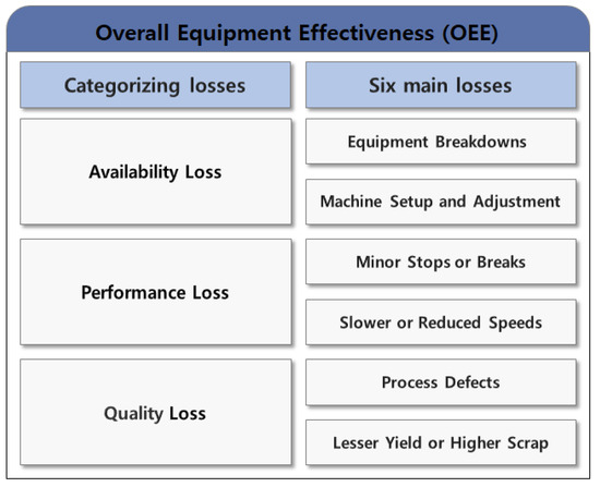 TPM aims to reduce the need for additional capital investment by enhancing the availability of existing equipment [22]. It seeks to increase the availability and effectiveness of existing equipment by optimizing maintenance practices and investing in human resources to lower the equipment’s life cycle cost [23]. TPM’s goals include extending the equipment lifespan, minimizing breakdowns, eliminating slow operations or minor stops, and achieving zero defects and incidents while actively involving operators [24]. Additionally, there are six primary production losses targeted by TPM, as illustrated in Figure 2.
