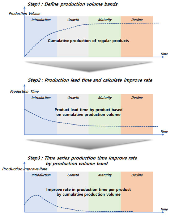 Step1 is to define the production-volume bands. Step2 is to calculate the production lead times and improvement rates. Finally, Step3 is to analyze the time series production lead time improvement percentages based on the production volume bands, as depicted in Figure 5.