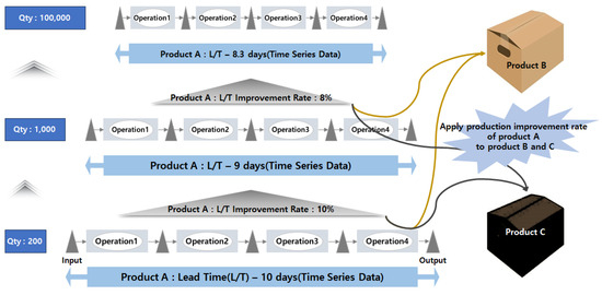 Let us consider a future scenario where you have a product labeled AA, which requires 4 min of lead time (L/T) for production in process A. It is noteworthy that the production plan type for this product aligns with the one that generated the production time improvement rate illustrated in this study. By applying the data from the production time improvement rate, we can ascertain that the L/T for process A in the case of product AA stands at 4 min. Furthermore, as production periods accumulate, it becomes evident that the L/T for this process progressively decreases. This transformation of the production time for process A in the context of product AA into time series data effectively encapsulates the productivity improvement rate. These data can serve as a foundational resource within an APS system, enabling the forecasting of potential production and overcapacity. Moreover, they can also serve as valuable reference information for evaluating past and present improvement rates when shaping future productivity enhancement objectives.