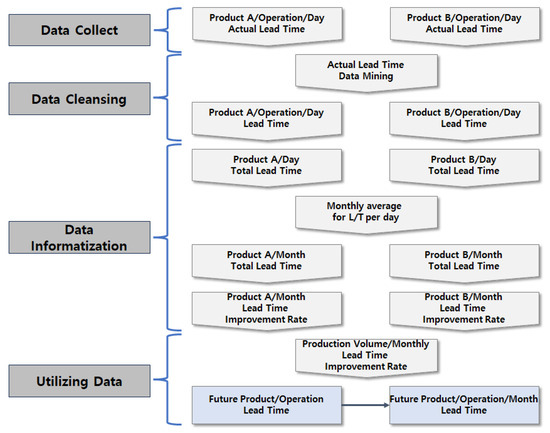 The information about the production time for each process in the product is the result of the data collection and data cleansing processes in Figure 7. Data collection is the step of collecting data from the machines. Data cleansing involves removing outliers for the statistical processing of the collected data. The production time information aggregated through this process was stored in the MES. By utilizing the aggregated daily product/process/lead time information, the process time can be summed up to the finished product-by-process. The L/T was calculated by summing the time spent on each process from start to finish based on the date on which the finished product was produced. This L/T information was then averaged over a month to calculate the monthly L/T. This process corresponds to “Data Informatization” in Figure 7.