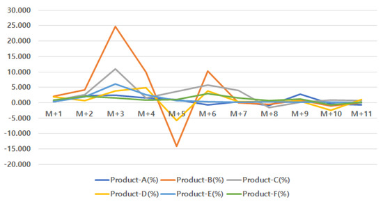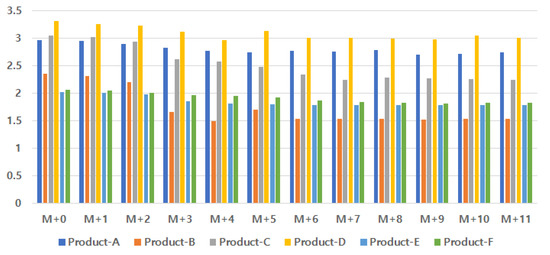 We calculated the production time improvement rate using products with the same production volumn, employing the harmonic mean (Product-A, …, F) of the monthly improvement rates for products sharing the same production bin definition, as shown in Figure 10 and Figure 11 and Table 7.