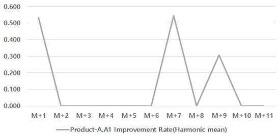 Table 9 shows the production improvement rates of product-A and product-A1 with the same base product, and Table 10 shows the harmonized average of the production improvement rates of product-A and product-A1. Figure 12 is a graph of the production improvement rate of product-A and product-A1, and Figure 13 is a graph of the harmonized average of the improvement rate of product-A and product-A1. In the previous experiment, the production improvement rate calculation method for products with the same base product often did not calculate the improvement rate by the harmonic average calculation method, so it was not possible to know the trend of the products for the improvement rate, and it was not suitable for the monthly production improvement rate calculation method because the production cycle of the products is different even if the base product is the same. On the other hand, the current research method of calculating the production improvement rate among products with similar production volume reflects the trend of the improvement rate of the products reflected in the harmonized average improvement rate calculation. In addition, it can be seen that there are many improvement activities for products with high production volume in productivity improvement.