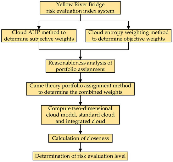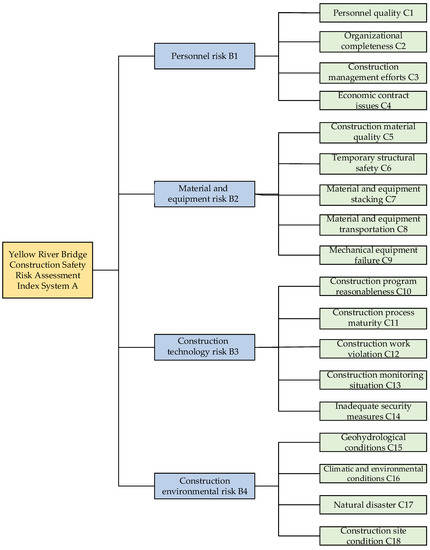 In recent years, the rapid economic development of the Yellow River basin in China has led to the construction of a series of bridges across the Yellow River with high construction difficulty and large investment scale that have brought great convenience to regional socio-economic activities. However, the Yellow River basin is generally characterized by complex landforms, harsh geological conditions, and a changeable climate environment. Additionally, the Yellow River has a large sand content, a freezing period in winter, and a flood season in some river sections. The difficulty of constructing super-large bridges in the Yellow River basin is much higher than that in other areas, and problems related to difficult construction, long construction periods, difficult transportation of materials, and equipment are encountered. The construction risk is greatly increased, which can easily lead to construction safety accidents and can affect the sustainable development of bridge structures [1]. During bridge construction, risk usually includes two aspects: on the one hand, the possibility of risk accidents, that is, the risk probability; on the other hand, the severity of losses caused by risk accidents, also known as risk losses [2]. If risks are not effectively managed and controlled during the bridge construction process, they can easily lead to extremely serious losses, mainly in the form of structural damage to bridges, casualties, and schedule delays, which bring extremely negative impacts [3]. So far, there have been occasional safety accidents in the field of bridge construction, such as the sudden collapse of the beam body of the main beam of the Baiqiaokeng Bridge in Guangdong Province and the sudden collapse of the bridge-erecting machine when the prefabricated box girder was assembled as part of Jiashao Bridge in Zhejiang Province. The reasons are numerous, involving various aspects such as design, construction, environment, and management factors [4]. In view of the current research on the safety risk assessment of the construction of bridges across the Yellow River, most of the research focuses on qualitative analysis, which is easily limited to the study of the direct risk factors of safety accidents and lacks in-depth analysis of the nature and mechanism of risks. In addition, during construction, bridges across the Yellow River are affected by many factors such as social environment, natural environment, construction personnel, management, construction technology, materials, and equipment, and these uncertain factors greatly increase the difficulty of construction control. Therefore, it is necessary to establish a better scientific construction safety evaluation index system for bridges across the Yellow River, reasonably evaluate the construction safety risk level of bridges across the Yellow River, adopt an intuitive way to reflect the results of risk evaluations, and take corresponding control measures for high-risk-level indexes in time to ensure the absolute safety of bridge construction.