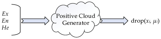 The forward cloud generator is used to convert three cloud digital eigenvalues (Ex, En, He) into several cloud drops (xi, µi) of the normal cloud model, that is, to quantitatively express a qualitative concept through the uncertainty transformation model. A schematic diagram of the forward cloud generator’s operation is shown in Figure 3.