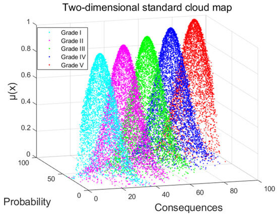 According to the standard cloud digital characteristics in Table 3, taking the probability of risk occurrence and the severity of risk consequences as benchmarks, we used MATLAB programming to draw a two-dimensional standard cloud map, as shown in Figure 5.