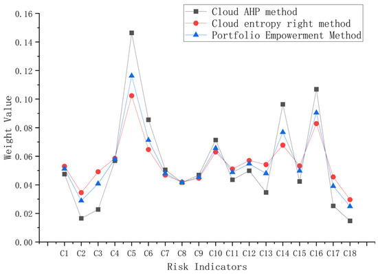 It can be seen from the above table that construction material quality C5, climatic and environmental conditions C16, insufficient security measures C14, temporary structure safety C6, construction program reasonableness C10, and economic contract issues C4 have relatively large weights, which belong to four different first-level indicators. The weight of the second-level indicators under each first-level indicator has a large difference, which makes the calculated weight value more reliable. The weight comparison of risk indicators obtained by different weighting methods is shown in Figure 7.