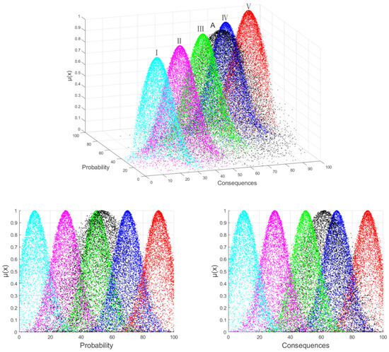 We input the digital characteristics of the first-level index risk probability cloud and consequence cloud and the comprehensive construction risk cloud digital characteristics from Table 16 into a forward cloud generator in MATLAB to generate a two-dimensional comprehensive cloud image and compared it with the two-dimensional standard cloud image. The preliminary determination of the construction risk level of each index is limited to the space, and only a comparison chart of the overall construction risk’s comprehensive cloud and the standard cloud is shown in Figure 8.