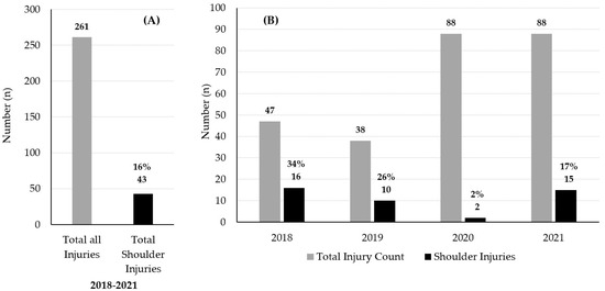 (A) The total number of all injuries and the number and percentage of all shoulder injuries during the 2018–2021 seasons. (B) The total number of all injuries and the number and percentage of shoulder injuries each year. The SARS-CoV-2 (COVID-19 virus) global pandemic in 2020 negatively influenced participation in all sports.