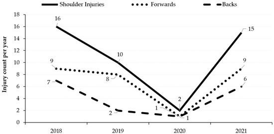 Forwards (n = 27; 63%) sustained more shoulder injuries compared to backs (n = 16; 37%). The incidence of shoulder injuries in forwards was 27.52 (17.14–37.90) and in backs was 18.63 (9.50–27.75). The total injury count for all shoulder injuries sustained by forwards and backs for each season is depicted in Figure 3.