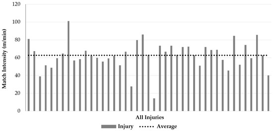 The average match intensity is plotted against the match intensity of each injury in Figure 4. Over the 4 seasons of play, the average match intensity for the 43 shoulder injuries was 62.54 ± 15.63 m/min (Range 14.30–101.20). A total of 25 (58%) injuries occurred at a match intensity above 60 m/min.