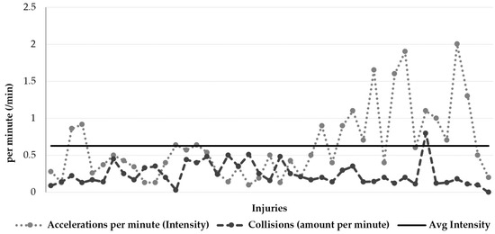 The intensity (accelerations/min) and collisions (amount/min) are plotted against the average intensity of each injury in Figure 5. The average intensity (acceleration) was 0.63/min for the 43 injuries. The highest acceleration recorded was 2/min. Typically, when the accelerations increased above 0.50/min, the collisions remained below 0.50/min, except in one instance.