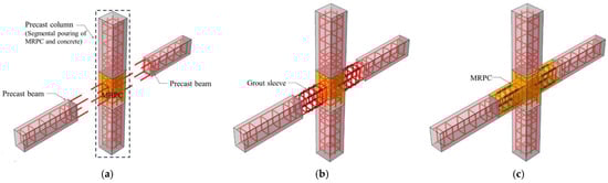 Construction sequence of an assembled beam–column connection. (a) Production of precast components. (b) Assembling and sleeve grouting. (c) Casting of MRPC in situ.