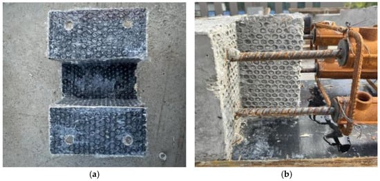 The interface between the precast beam and the MRPC was the structure’s weak region. To increase interface bonding, the assembled beams’ ends were irregularly shaped, and an air bubble film was pasted on the formwork to increase its roughness [], as shown in Figure 4. Assembled beam–column connections using MRPC in critical cast-in-place regions are shown in Figure 5.