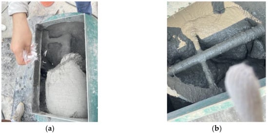Notably, during MRPC manufacturing, cementitious materials are first poured into a slightly wet mixer in sequence and then mixed dry for 1.5 min. Next, small quantities of steel fibers, water-reducing agents, and PP fibers are poured into the mixer multiple times and further mixed for 2 min. Finally, water is gradually poured into the mixer, and stirring continues for 2 min until all materials are thoroughly mixed and exhibit good fluidity, as shown in Figure 6.
