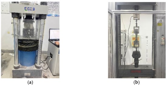 The MRPC mix ratio was determined using mechanical performance tests. MRPC compressive test specimens were 100 mm × 100 mm × 100 mm cubes, and tensile test specimens were 100 mm × 15 mm and dog-bone-shaped. C35 compressive test specimens were 150 mm × 150 mm × 150 mm cubes. The mix ratio of C35 is shown in Table 4. Testing instruments are shown in Figure 7. To accurately obtain the MRPC’s strength in beam–column connections, the same batch of concrete mechanical performance tests were conducted during the pouring of beam–column connections, as shown in Table 5.