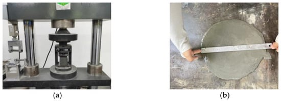 The sleeve was manufactured using nodular cast iron full grout, and the two ends were sealed with rubber plugs. When installing the sleeve, it was necessary to ensure that the grouting inlet and outlet were located upward so that the grouting material was smoothly injected into the sleeve, as shown in Figure 8. The grouting material’s compressive strength and fluidity tests are shown in Figure 9. The grouting material’s compressive strength at days 1, 3, and 28 was determined, as shown in Table 6. The grouting material’s fluidity results are shown in Table 7.