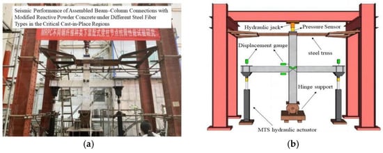 Ultra-high-performance concrete (UHPC) has been proven to have excellent mechanical performance and durability. Fibers inside the concrete act as bridges in the matrix, inhibiting the development of cracks and dissipating energy. Stress on the crack’s surface is distributed to the surrounding area, and the crack is narrow and dense. Therefore, many scholars have reduced reinforcements and improved seismic performance by using UHPC in beam–column connections’ critical cast-in-place regions. Deng et al. [] applied high ductility fiber-reinforced concrete (HDC) to assembled beam–column connections’ critical cast-in-place regions and tested its seismic performance under low-reversed cyclic loads. Gul et al. [] applied engineered cementitious composites (ECC) to assembled connections and studied the quasi-static cyclic behavior of special moment-resisting frame structures.