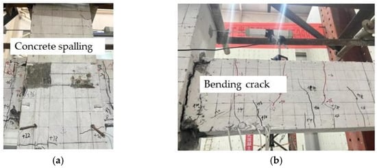 Specimen XJ exhibited a beam-end bending failure pattern, as shown in Figure 11a. The poor tensile performance of concrete leads to rapid cracking of the tensile zone of the beam under external forces, transferring stress to the steel bars. Therefore, the first vertical crack appeared in the beam’s tension area, and then oblique cracks began to appear in the area closer to beam–column interfaces. When loading entered the late stage, macroscopic cracks appeared at the end of the beam. Finally, the beam–column connections’ concrete fell off, the reinforcement yielded, and the specimens were severely damaged. The integral RC beam–column connections had significant brittleness characteristics and poor seismic performance. Although the failure pattern of assembled specimens was also beam-end bending, MRPC’s tensile strength was higher, and the steel fibers could better inhibit crack occurrence and development; the number and width of cracks were significantly reduced. In addition, there was no concrete spalling off the MRPC surface, as shown in Figure 11.