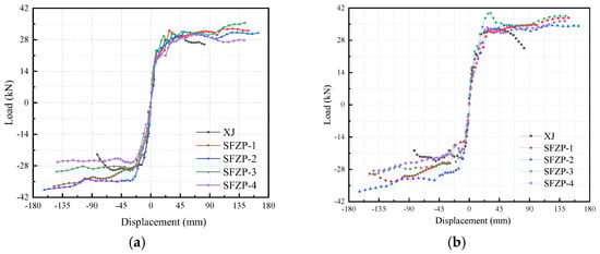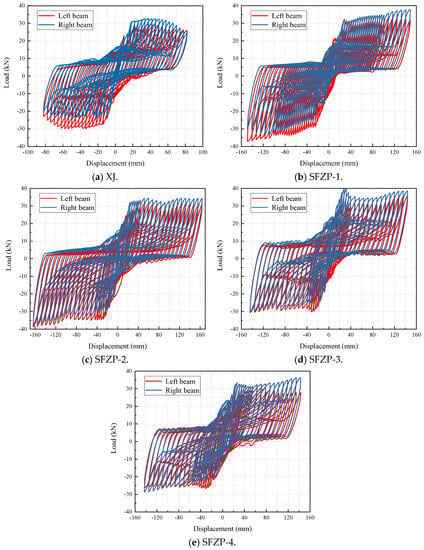 Load–displacement hysteretic loops. (a) XJ. (b) SFZP-1. (c) SFZP-2. (d) SFZP-3. (e) SFZP-4.