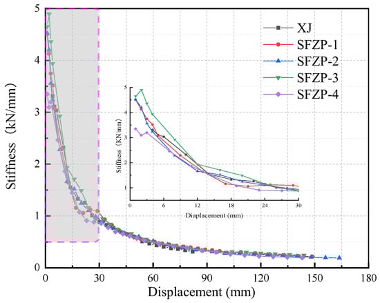 Although the assembled specimens had weak regions due to secondary pouring, their initial stiffness was higher than that of XJ. This showed that the integrity of MRPC-assembled connections was excellent. The initial stiffness of SFZP-3 and SFZP-2 was relatively large, indicating that MRPC with end-bent steel fibers had relatively good resistance to deformation. SFZP-3’s initial stiffness was the largest because SF-3 was easier to stir, and its distribution of fibers was more uniform. In the later loading stage, because it was short, the steel fiber pulled out and withdrew from the sample, and the rate of stiffness decline obviously increased. The stiffness degradation of the MRPC with 30 mm end-bent steel fibers more effectively delayed crack development during the entire loading process and, to a certain extent, reduced damage accumulation. SFZP-4’s initial stiffness was only slightly higher than that of XJ. It might be that the interface bonding between MRPC and the assembled beam was relatively poor, which reduced the specimen’s stiffness.