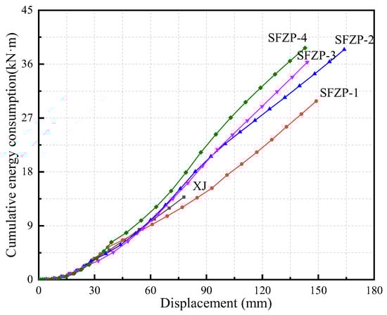 Figure 16 illustrates that there were almost no differences in the elastic stage. When the displacement was less than 80 mm, SFZP-1’s energy consumption was less than that of XJ, indicating that the linear steel fiber reduced the RPC matrix’s damage resistance. In the later loading stage, a plastic hinge area formed at the end of the beam and became the main energy dissipation area. SFZP-3’s energy dissipation capability was better than that of SFZP-2. Because the superposition effect of the PP fiber and steel fiber interface layer [] strengthened the PP fiber interface (although SF-3 had a smaller volume and a larger number), the interface layer’s superposition effect was better. Due to wavy steel fibers’ continuous irregular shape and longer length, the sliding friction force between wavy steel fiber and the matrix was greater under cyclic loading, consuming more energy. SFZP-4 had the best energy dissipation capacity.