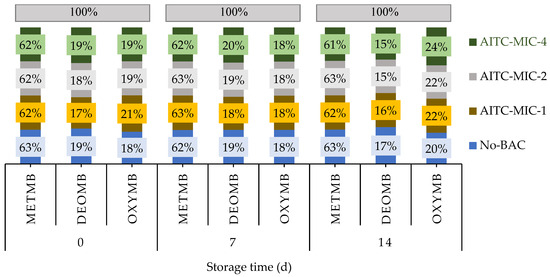 Figure 1 presents the outcomes of AITC on MetMb, DeoMb, and OxyMb fresh chicken meat pigments. At the beginning of storage, the initial DeoMb percentages in control, AITC MIC-1, MIC-2, and MIC-4 were 19%, 17%, 18%, and 19%, respectively. These percentages were subsequently reduced to 17%, 16%, 15%, and 15%, correspondingly, at the end of the storage period. Based on the present findings, the levels of MetMb and DeoMb in chicken meat treated with AITC were reduced, particularly in meat that contained MIC-4. MetMb levels were reduced from 62% to 61% and DeoMb levels decreased from 19% to 15% after 14 days of storage. At the same time, OxyMb levels increased from 19% to 24%. There were no significant changes in MetMB levels in the control samples; however, there was a concurrent decrease in DeoMb levels and increase in OxyMb levels. The findings from this study confirm previous research suggesting that the heightened L* in fresh meat results from increased OxyMb auto-oxidation and the generation of reactive oxygen species [60,61]. Discoloration of fresh meat during processing may be caused by conformational changes in Mb, such as globin denaturation or oxidation of ferrous ions [62]. It has been reported that the color change in chicken meat mainly arises due to denaturation of myoglobin, release or displacement of heme and oxidation of ferrous myoglobin to ferric MetMB [1].