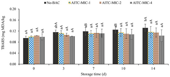 Effect of different concentrations of AITC on TBARS values of chicken meat stored up to 14 days at 4 °C. * a,b Means with different superscripts are significantly different regarding the storage days; A,B means with different superscripts are significantly different regarding the concentrations of AITCs (p < 0.05).