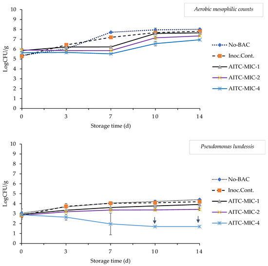 Effect of various AITC concentrations on aerobic mesophilic counts of Pseudomonas lundessis, Listeria monocytogenes, and Salmonella Typhimurium of chicken meat kept for up to 14 days at 4 °C. The arrow line (↓) represents the numbers below the detection limit.