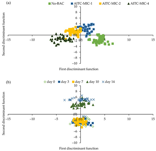 Effect of various AITC concentrations on odor detection by E-nose in chicken meat kept for up to 14 days at 4 °C. Canonical discriminant analysis score plot of (a): the separation based on the AITC concentration, (b): the separation based on storage days, and (c): the separation based on storage days and AITC concentration.
