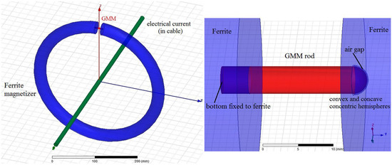 The overview (left panel) and the local scaled (right panel) schematics of the GMM-ferrite assembly component in the GMM-FBG current sensor model.