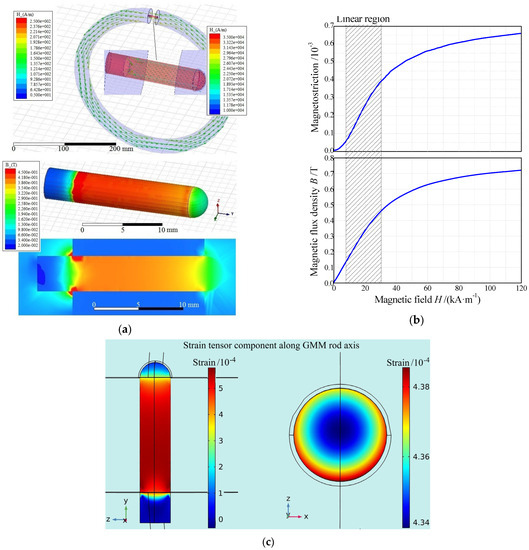 (a) Magnetic field vector (top panel) in ferrite-GMM assemblage and magnetic induction intensity (bottom panel, contoured on GMM surface and axial longitudinal section) in GMM rod; (b) Magnetostriction (top panel) and magnetic flux density (bottom panel) versus magnetic field on the center of the GMM rod; (c) Longitudinal stretching component of strain tensor field in the GMM rod contoured on the longitude (left) and cross (right) sections.