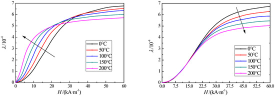 Magnetostrictive coefficient varying with the magnetic field magnitude at the center of the GMM rod at 0–200 °C temperatures for the simulations with and without consideration of thermal strain in ferrite loop, being shown in the left panel and right panel, respectively.