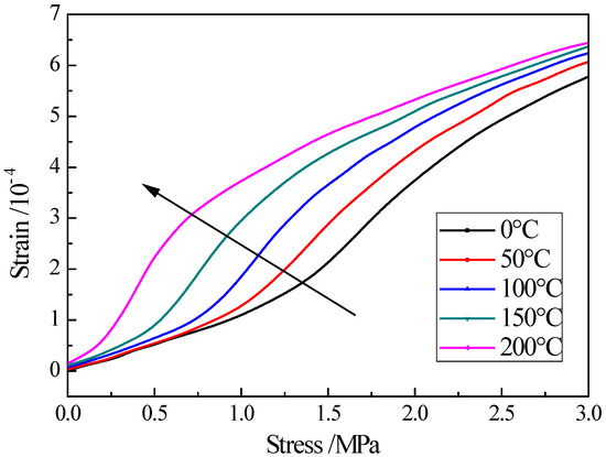 Magnetostrictive stress-strain curves at the center of the GMM rod at 0~200 °C temperatures.