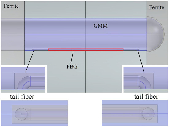 In the modeled GMM-FBG optical modulator, the FBG is directly contacted with the GMM rod on the side surfaces to construct a GMM-FBG strain-optical modulation component capable of effectively transferring magnetostrictive strain along the axial direction in the GMM rod under current excitation, as shown in Figure 5. The rectangular groove in a dimension of 0.2 mm × 0.2 mm × 13 mm is excavated out on the side surface and along the longitudinal axis of the GMM rod, in which a bare FBG (without an outer protective layer) with a tail fiber is placed and fixed by a filling binder in the interval space. The FBG in a sufficient length of 10 mm is located at the center of the long and narrow groove with two residual spaces of 1.5 mm length at the FBG terminals to accommodate the tail fibers, as shown in Figure 5. Epoxy resin material is used as a binder for fixing and protecting the bare FBG. The FBG is specified by the standard 9/125 μm single-mode fiber: the core diameter and cladding thickness are 9 μm and 125 μm, respectively; the core material is defined by germanium-doped quartz as an elasto-optical coefficient of P11 = 0.121 and P12 = 0.27, Poisson’s ratio of ν = 017, and refractive index of n = 1.469 (1550 nm). For specifying boundary conditions in finite-element simulations, the solid mechanical model of GMM-FBG fixation is constructed by setting the joint constraint (relative fixed constraint) to the contacting interfaces of the FBG cladding layer/solid binder, GMM/binder (five faces of groove), and FBG core/cladding.