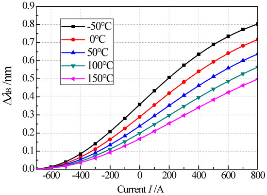 According to the elasto-optical effect, the refractive index of the FBG core being altered by thermal stress in the GMM-FBG optical modulator can be calculated from the elasto-optical tensor of the FBG core material with Equation (2) and the results of the thermal stress/strain simulations with material characteristics specified for the GMM-FBG modulator as listed in Table 2. The small thermal expansion coefficients of silica quartz glasses making up FBG imply that no considerable expansion or shrinkage will appear when the temperature changes. In contrast, the thermal expansion coefficient of epoxy resin used for gluing FBG on the GMM side in the groove is significantly higher than that of FBG. As a result, the thermal stress/strain along the longitudinal axis will be produced under the restraint of the GMM rod when the temperature changes. The sensing characteristics of the GMM-FBG current sensor represented by the Bragg wavelength as a function of the excitation current at various temperatures are shown in Figure 6. The Bragg wavelength differential signal sensitive to static current represents a substantial abatement by temperature elevation in both the gradient and amplitude of response curves, leading to the foreseeable reductions of sensitivity and range, which means the GMM-FBG current sensor needs to be calibrated according to the work temperature.