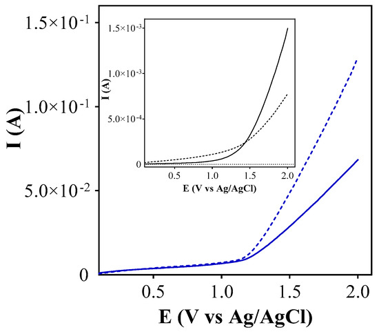 Figure 1 compares the linear polarization curves of the DSA and BDD electrodes obtained at a lower concentration of commercial ACT (30 mg L−1) using 0.5 M Na2SO4 as the supporting electrolyte with a scan rate of 100 mV s −1. The DSA anodic polarization curve shows that the oxygen evolution reaction (o.e.r.) starts at a potential close to +1.2 V vs. Ag/AgCl, confirming the active anode behavior towards oxygen evolution [,,,,]. Conversely, the o.e.r. is attained at about +1.7 V vs. Ag/AgCl at the BDD anode according to the polarization curve (Figure 1), presenting a higher oxygen potential than that achieved at the DSA anode. This is an expected result since non-active anodes have higher oxygen potentials than active anodes []. Thus, the BDD anode has a higher energy efficiency during the degradation of organic compounds in solution when compared to the DSA electrode [].